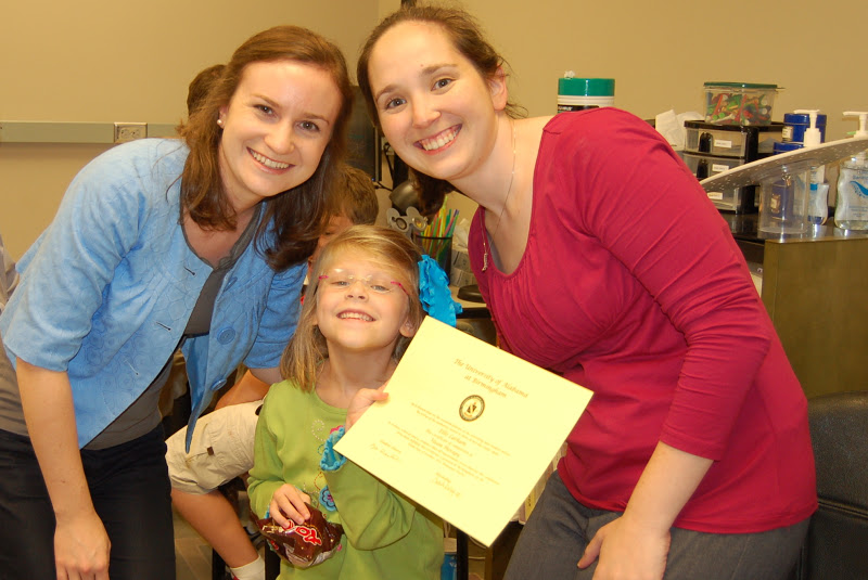 At the end of Ellie's exam, Dr. Hopkins came in and confirmed that she was an excellent candidate for vision therapy. She explained that Ellie would come once a week for twenty visits where an optometry student in his or her last semester of school would work with her. Dr. Hopkins started the vision therapy program at UAB, and I could tell that the students were loving working with her and her ideas. (Dr. Hopkins has since moved to Atlanta, but Dr. Rah and Dr. Dillie have done a fabulous job taking over!!)